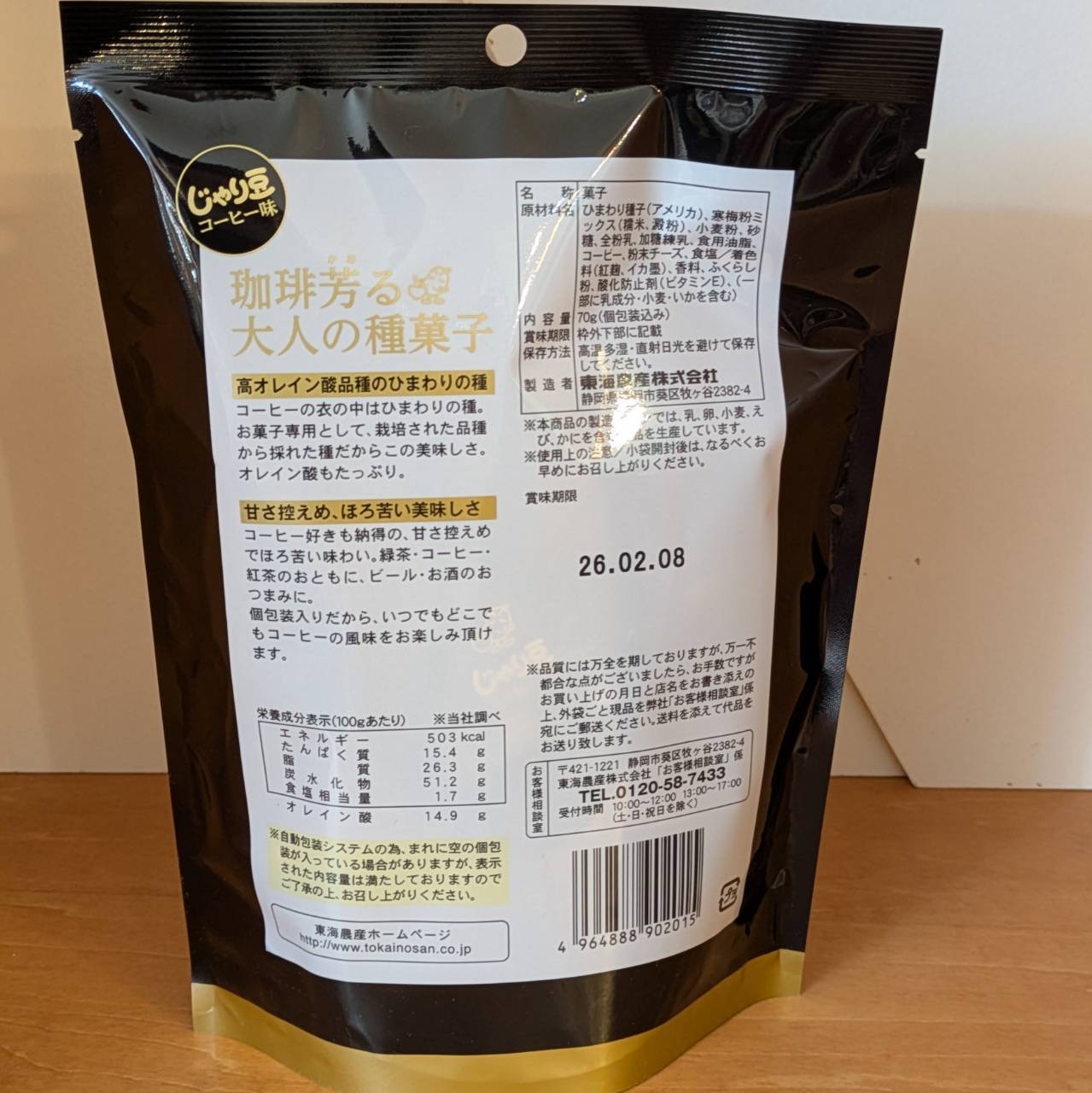 【原材料名】ひまわり種子(アメリカ)、寒梅粉ミックス(糯米、澱粉)、小麦粉、砂糖、全粉乳、加糖練乳、食用油脂、コーヒー、粉末チーズ、食塩、/着色料(紅麴、イカ墨)、香料、ふくらし粉、酸化防止剤(ビタミンE)、(一部に乳成分・小麦・いかを含む)