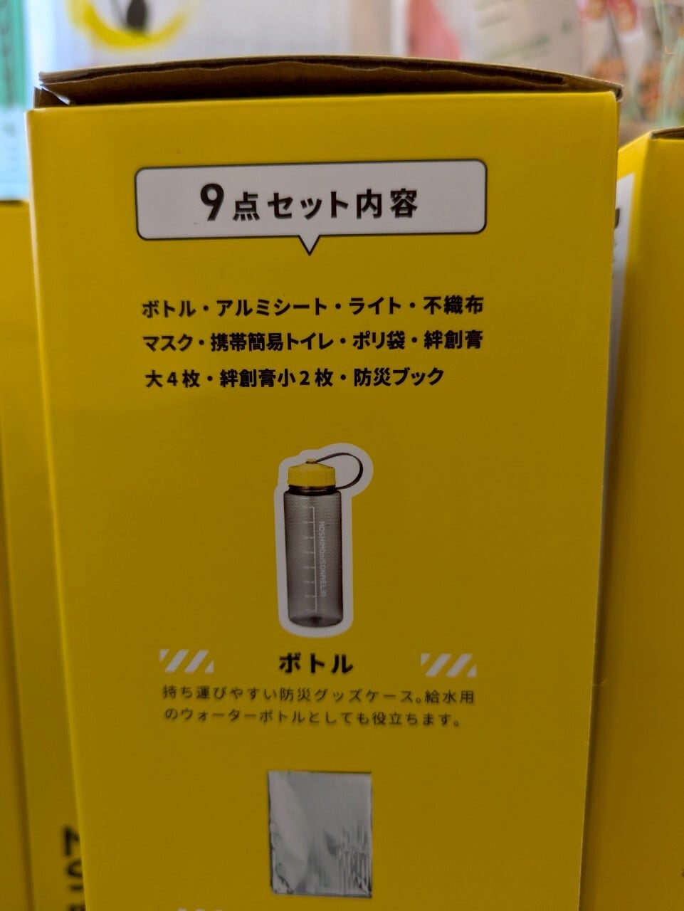 ボトル(容量:940ml)・アルミシート(1400×700mm)・ライト(単三乾電池2本使用/別途)・不織布マスク・携帯簡易トイレ・ポリ袋・ばんそうこう(大×4、小×2)・防災ブック